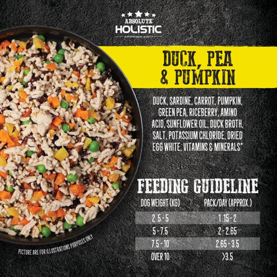 Absolute Holistic® Home Cooked Recipe with Duck, Peas & Pumpkin is formulated to meet the nutritional levels established by AAFCO dog food nutrient profiles for all life stages including growth of large size dogs (70 lbs or more as an adult)
