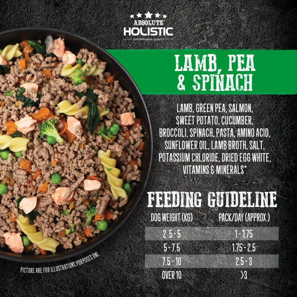 Absolute Holistic® Home Cooked Recipe with Lamb, Peas & Spinach is formulated to meet the nutritional levels established by AAFCO dog food nutrient profiles for all life stages including growth of large size dogs (70 lbs or more as an adult)