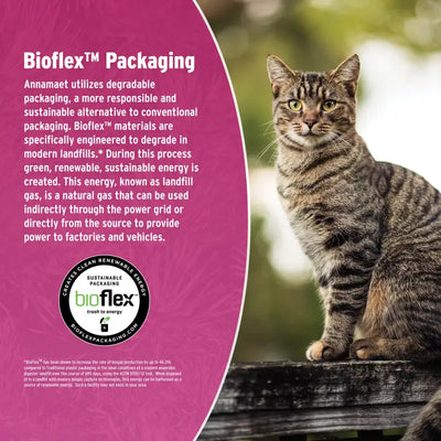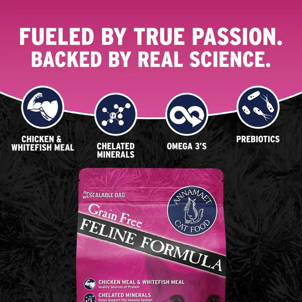 "Made with chicken and fish, this grain free, high protein formula stays loyal to the cat's carnivorous background. Annamaet's Grain Free Feline formula contains natural sources of antioxidants from blueberries and cranberries as well as specially coated Vitamin-C. Its optimal protein and fat blend encourages healthy skin and coat. This grain free cat food is formulated to meet the nutritional levels established by the AAFCO cat food nutrient profiles for ""ALL LIFE STAGES"" (Gestation, Lactation, Growth, and Maintenance).
