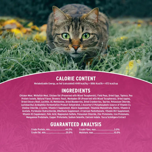 Chicken Meal, Whitefish Meal, Chicken Fat (Preserved with Mixed Tocopherols), Field Peas, Dried Eggs, Tapioca, Pea Protein Isolate, Natural Flavor, Brewers Yeast, Menhaden Oil (Preserved with Mixed Tocopherols), Dried Apples, Dried Chicory Root, Lecithin, DL Methionine, Dried Blueberries, Dried Cranberries, Taurine, Potassium Chloride, Lactobacillus Acidophilus Fermentation Product Dehydrated, L-Ascorbyl-2-Polyphosphate (source of Vitamin C), Choline Chloride, L-Lysine, Vitamin E Supplement, Niacin Supplement, Thiamine Mononitrate, Biotin, Vitamin A Acetate, Pyridoxine Hydrochloride, Riboflavin Supplement, d-Calcium Pantothenate, Vitamin B12 Supplement, Vitamin D3 Supplement, Folic Acid, Magnesium Sulfate, Potassium Chloride, Zinc Proteinate, Iron Proteinate, Manganese Proteinate, Copper Proteinate, Sodium Selenite, Calcium Iodate, Yucca Schidigera Extract.
