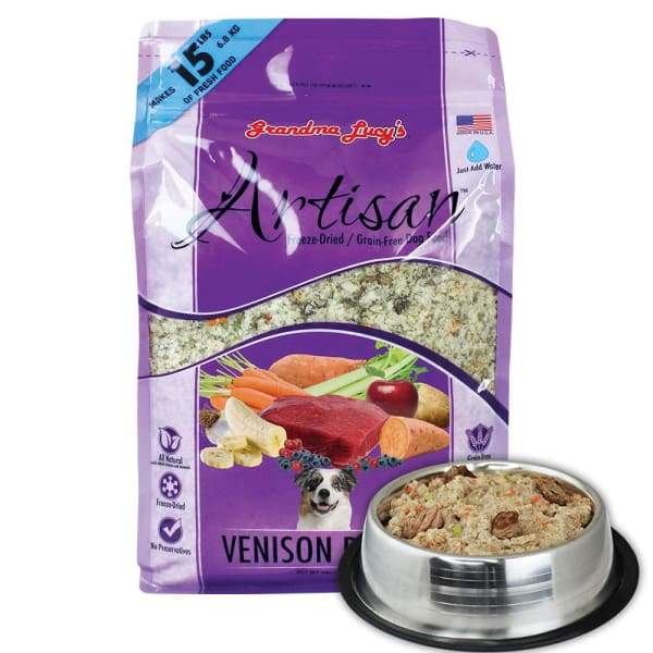 USDA Venison, Potatoes, Flax, Sweet Potatoes, Carrots, Celery, Apples, Bananas, Blueberries, Cranberries, Pumpkin, Garlic, Vitamin A, Vitamin D3, Vitamin E, Niacin, Iron, Calcium, Phosphorus, Zinc, Riboflavin, Thiamin, Potassium, Manganese, Chloride, Copper, Magnesium, Pyridoxine, Cyanocobalamin