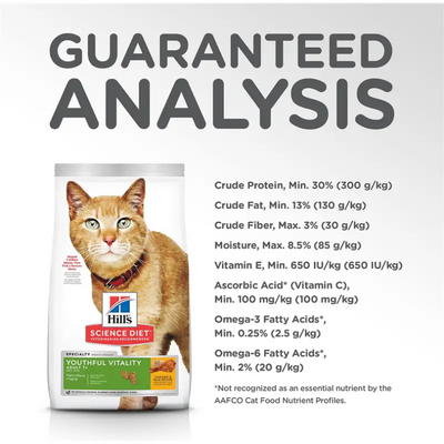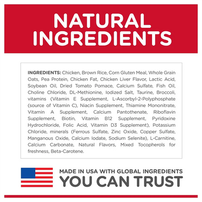 Chicken, Brown Rice, Corn Gluten Meal, Whole Grain Oats, Pea Protein, Chicken Fat, Chicken Liver Flavor, Lactic Acid, Soybean Oil, Dried Tomato Pomace, Calcium Sulfate, Fish Oil, Choline Chloride, DL-Methionine, Iodized Salt, Taurine, Broccoli, vitamins (Vitamin E Supplement, L-Ascorbyl-2-Polyphosphate (source of Vitamin C), Niacin Supplement, Thiamine Mononitrate, Vitamin A Supplement, Calcium Pantothenate, Riboflavin Supplement, Biotin, Vitamin B12 Supplement, Pyridoxine Hydrochloride, Folic Acid, Vitamin D3 Supplement), Potassium Chloride, minerals (Ferrous Sulfate, Zinc Oxide, Copper Sulfate, Manganous Oxide, Calcium Iodate, Sodium Selenite), L-Carnitine, Calcium Carbonate, Natural Flavors, Mixed Tocopherols for freshness, Beta-Carotene.