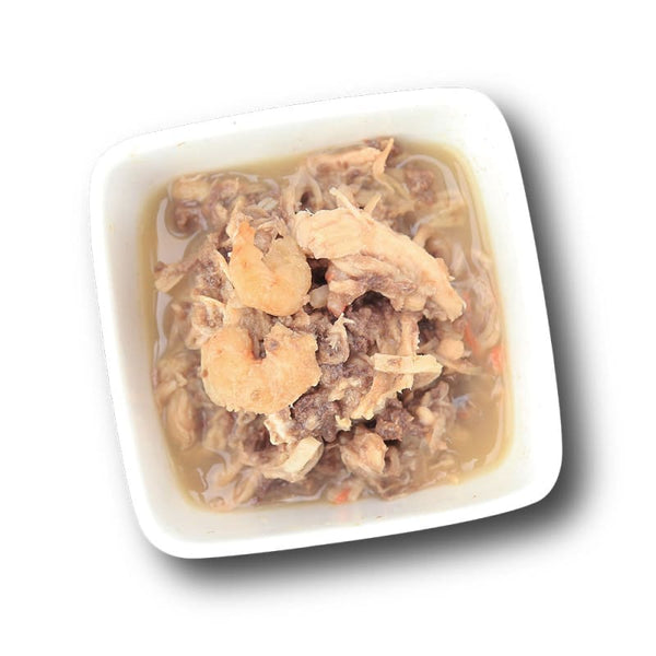 Chicken, Tuna Red Meat, Shrimp, Imitation Crab, Soybean oil, Vitamins and minerals (tricalcium phosphate, potassium chloride, magnesium sulphate, choline chloride, ferrous sulphate, zinc oxide, a-tocopherol acetate, nicotinic acid, vitamin A acetate, mangenese sulphate, copper proteinate, dicalcium phosphate, thiamine mononitrate, calcium pantothenate, riboflavin supplement, pyridoxine hydrochloride, biotin, vitamin b12 supplement, sodium selenite, cholecalciferol, menadione sodium bisulfitite complex, folic acid, potassium iodide, sodium chloride, magnesium oxide), pea fiber, flaxseed, salt, taurine