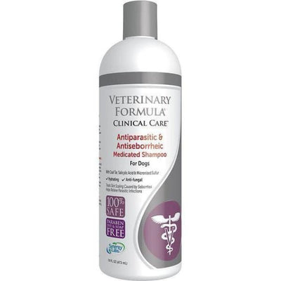 Veterinary Formula Clinical Care Antiparasitic & Antiseborrheic Shampoo is formulated with salicylic acid, coal tar and micronized sulfur that effectively treats symptoms of dermatitis, seborrhea, mange and other parasitic or bacterial infections. Helps soothe and eliminate scaling, rashes and inflammation. Oatmeal & allantoin hydrate skin and promote healing.